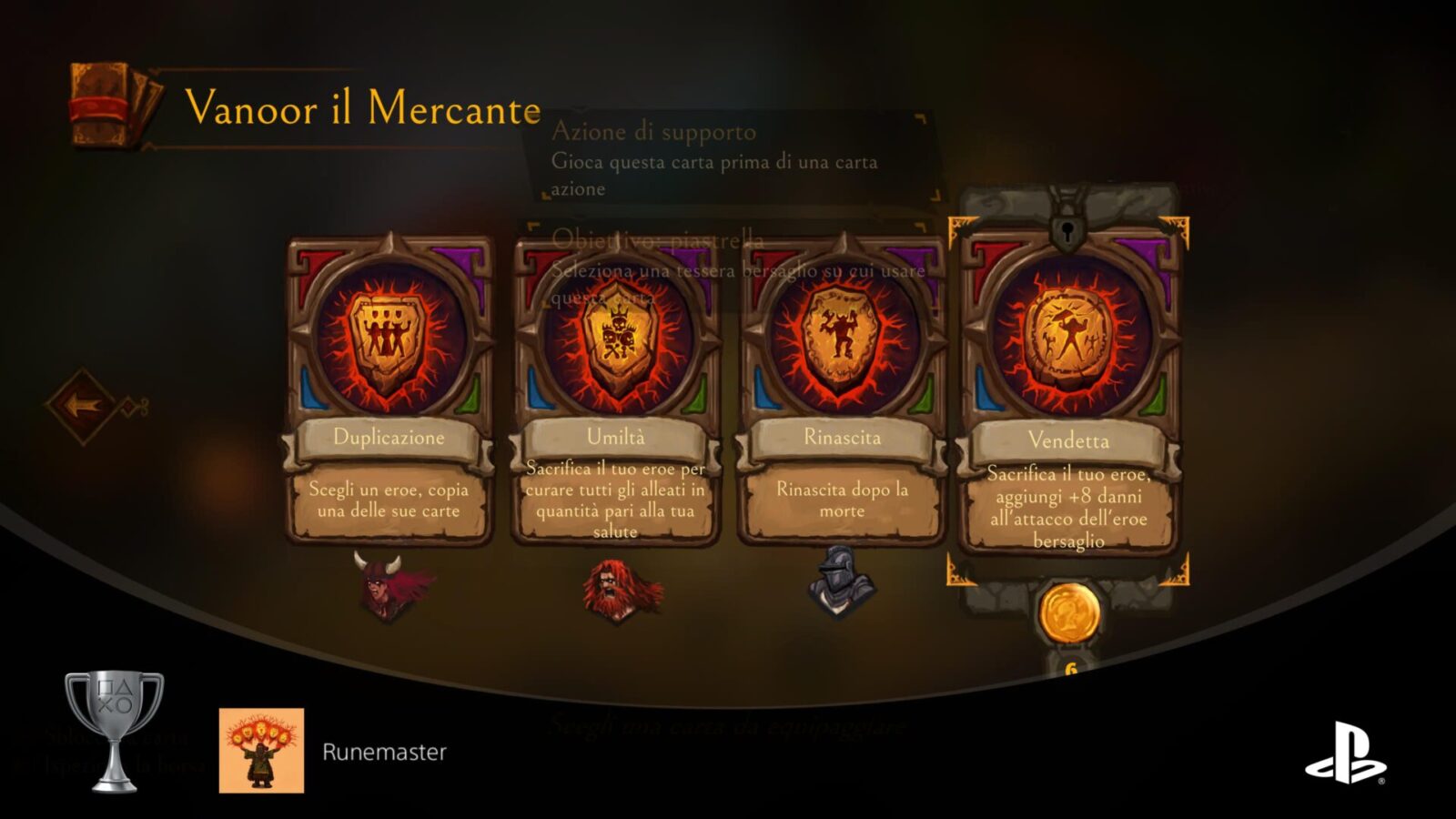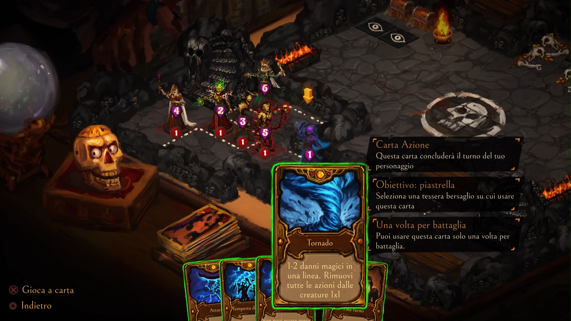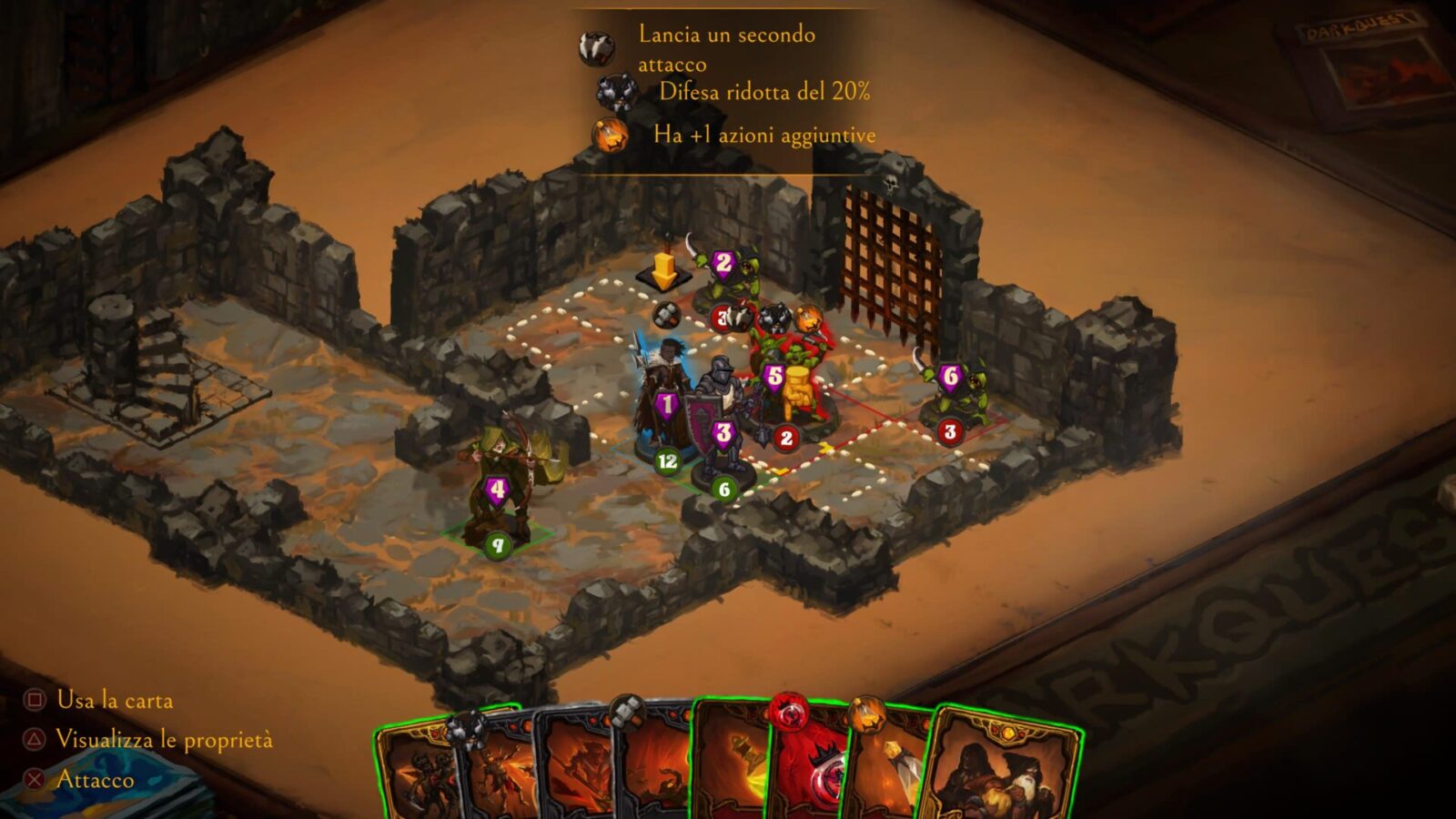 Non può mancare una carta per lanciare un’ascia, utile quando dobbiamo uccidere un nemico che ci spara da lontano con la magia oppure con arco e frecce. Se usiamo l’Arciere, una delle carte migliori è il Tiro Diviso, che ci permette di scagliare tre frecce verso altrettanti bersagli, colpendo così tre nemici in un colpo solo. Per il corpo a corpo c’è la carta Trafiggere con cui colpire i nemici adiacenti, oppure il Tornado per colpire quelli in linea anche se non vicini l’un l’altro.