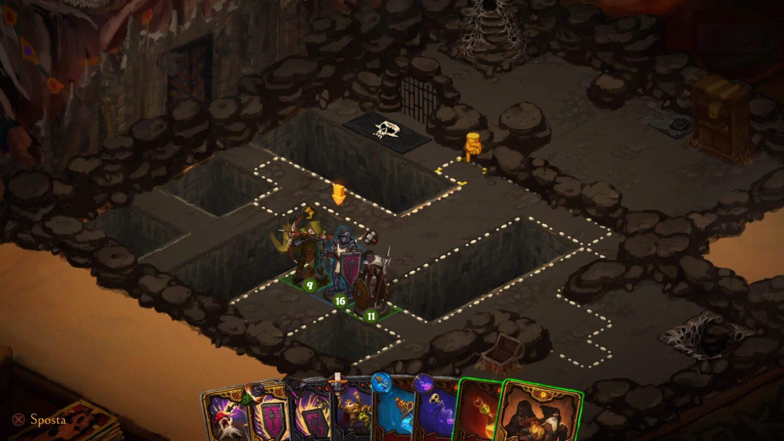 Una volta completati i primi dungeons, sbloccheremo anche gli ultimi personaggi, per un totale di 9 eroi tra cui scegliere. Al rientro da ogni missione, i tre eroi sono stanchi e feriti, ed è utile farli riposare rifacendo qualche vecchia missione in cerca di tesori utilizzando altri personaggi. Dopo aver riposato, alcuni personaggi ottengono un bonus di +1 sui PV, altri addirittura +3. Ed è proprio in questo momento che conviene usarli, assegnandogli le carte migliori dagli npc attorno, in modo da prepararli al meglio.