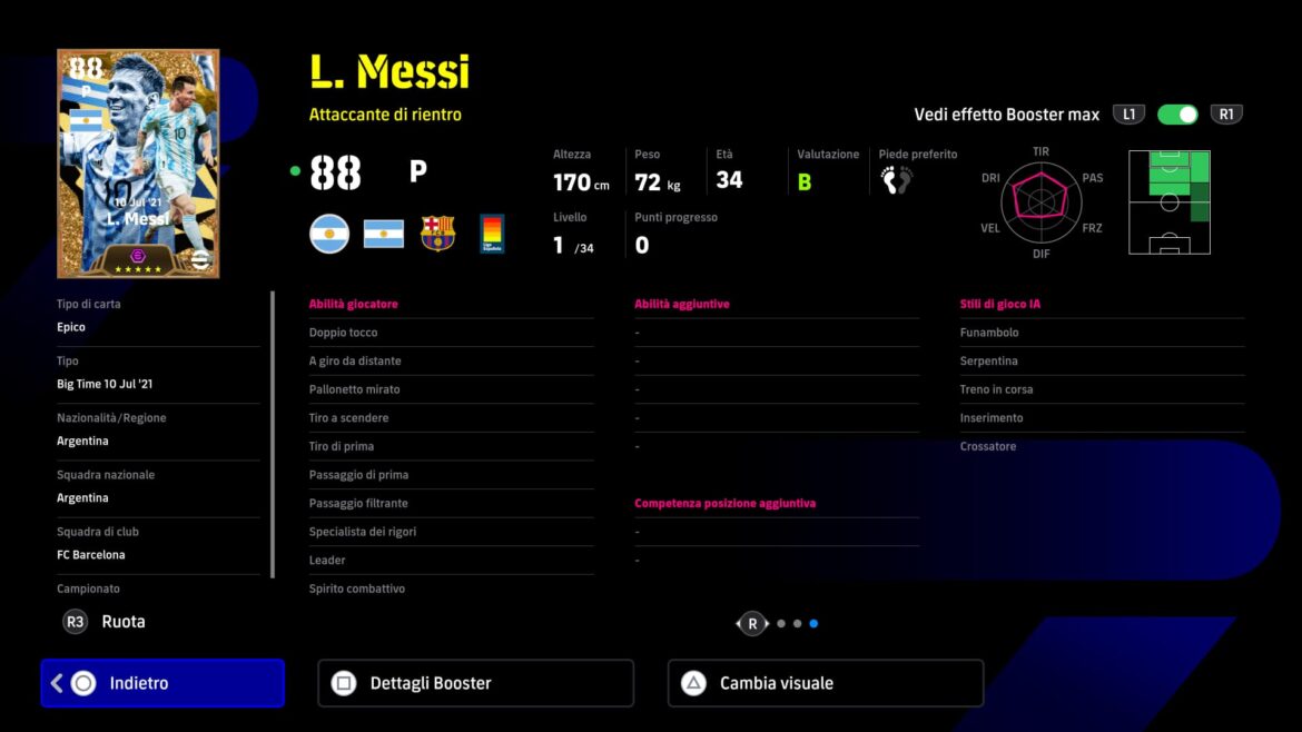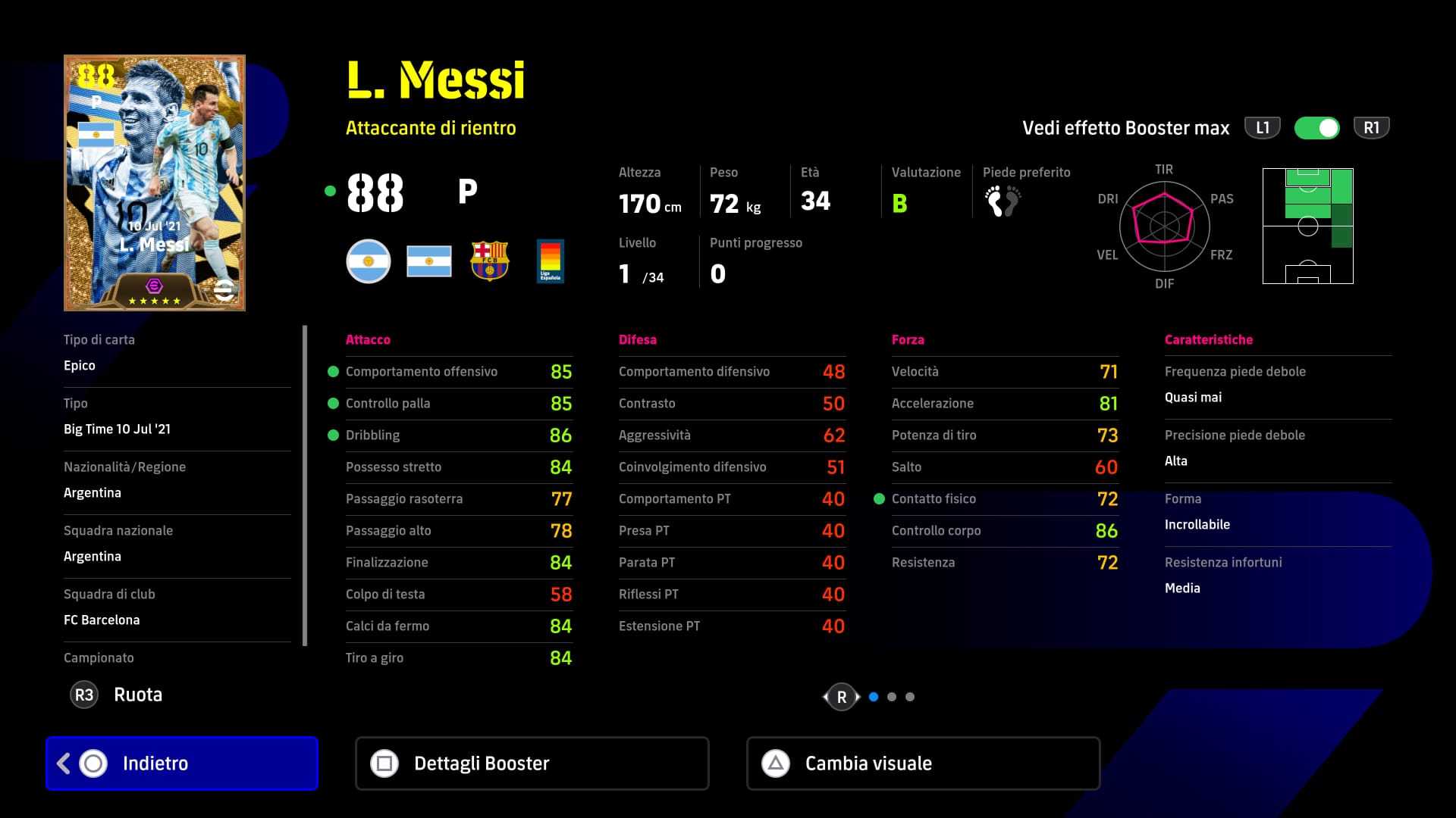 In particolare nel pool dell’ Argentina è caratterizzato dalla presenza di un Messi dalle caratteristiche importanti e dotato di un ottimo boost. Vediamo il dettaglio del giocatore nello slide qui di seguito.