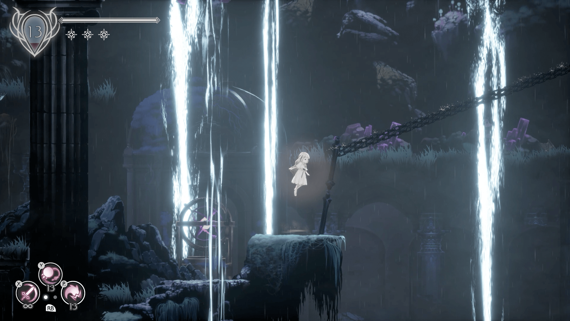 Una delle abilità presenti fin da subito è quella delle preghiere che, ripristinate ad ogni savepoint, permettono a Lily di usarne fino a 3 per recuperare buona parte dei PV, ed è anch’essa un’abilità potenziabile che aumenta la quantità di energia recuperata. A questa si affiancano le abilità secondarie, spesso ottenute dopo le mini boss fight contro gli impuri più potenti, alcune delle quali sono esseri evocabili e fungono quasi da companion. Ad esempio uno è simile ad un bruco, che compie un breve saltello e che possiamo lanciare contro i nemici; un altro è un rapace che spara fasci dal becco, anch’essi potenziabili in numero e danni; un altro ancora ci permette l’attacco dall’alto verso il basso con un’arma potente, che ci permette di colpire i nemici dall’alto evitandone i letali attacchi laterali oltre che aprirci un varco in alcuni punti dello scenario, aprendoci così nuove strade.