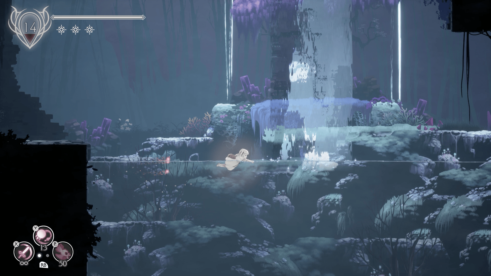 Alcune di queste sono rappresentate da grandi ingressi a forma di arco che, come visibile dalla mappa, ci portano in aree collegate isolate dal resto in fondo alle quali, solitamente, troviamo un oggetto o un impuro da combattere per ottenere un’importante abilità. Come sempre in queste produzioni, alcune saranno essenziali per continuare come il doppio salto o il poter nuotare sott’acqua; inizialmente, oltre al singolo salto in aria, a Lily è permesso cadere in acqua ma la giovane si limiterà a nuotare in superficie, anche piuttosto lentamente. Per trovare abilità ed oggetti, ma soprattutto la strada per progredire nell’avventura, ci viene incontro una mappa in cui i punti rossi sul bordo di ogni stanza rappresentano un ingresso o un passaggio per quella successiva, rendendo ben visibile l’accesso ad un’area non ancora visitata.