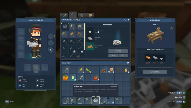 Il Kit di riparazione si crafta dal Workbench, nella sezione degli strumenti, la stessa dove realizzi picconi e asce. È disponibile solo dopo aver sbloccato alcune lavorazioni di base, quindi non è immediato nelle primissime fasi.