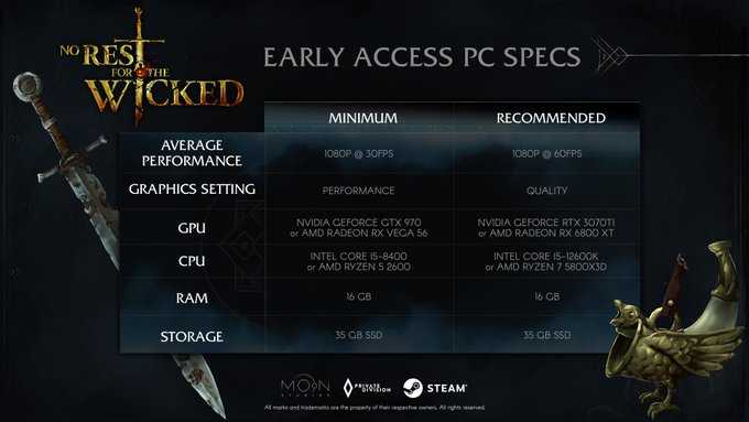 No Rest for the Wicked, requisiti minimi (1080p30, preset prestazioni)