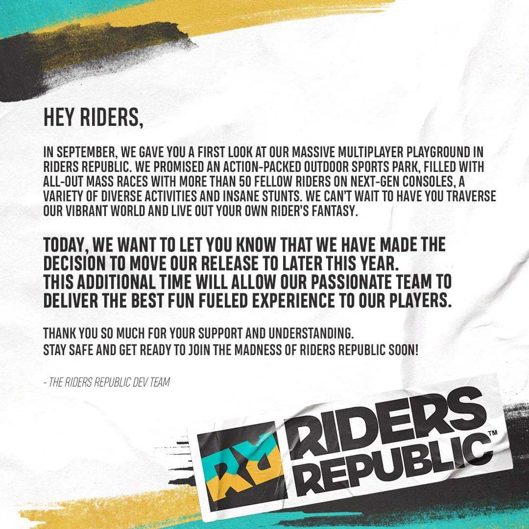 Altro giorno, altro rinvio. Dopo l’annuncio di ieri di Hogwarts Legacy, rimandato al 2022, è arrivato un altro rinvio: questa volta si parla di Riders Republic. Il nuovo titolo sportivo multiplayer di Ubisoft Annecy, lo studio dietro anche a Steep, era previsto in uscita per il prossimo 25 Febbraio 2021, ma proprio qualche minuto fa è arrivato uno statement da parte dello studio, che ha rimandato il titolo ad un generico 2021.